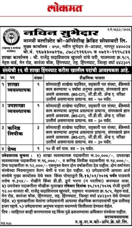 Navin Subhedar Nagari Sahakari Patsanstha Bharti 2026 – Nagari Multistate Co-Operative Credit Society Ltd., Hinganghat has released recruitment notification for various posts. Interested candidates can apply before the last date.