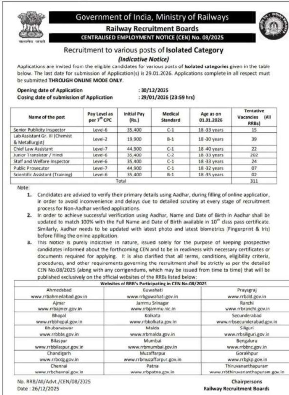 RRB Isolated Bharti 2026 अंतर्गत भारतीय रेल्वेने 311 Isolated Category पदांसाठी मोठी भरती जाहीर केली आहे. ही भरती Railway Recruitment Board (RRB) मार्फत Ministerial, Legal, Translation, Scientific आणि Welfare विभागातील पदांसाठी केली जाणार आहे.